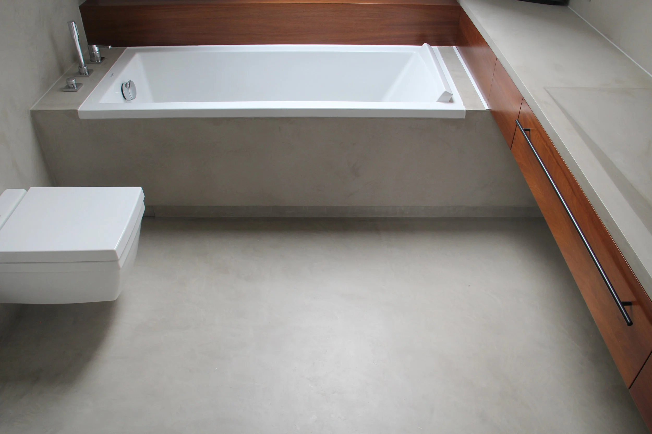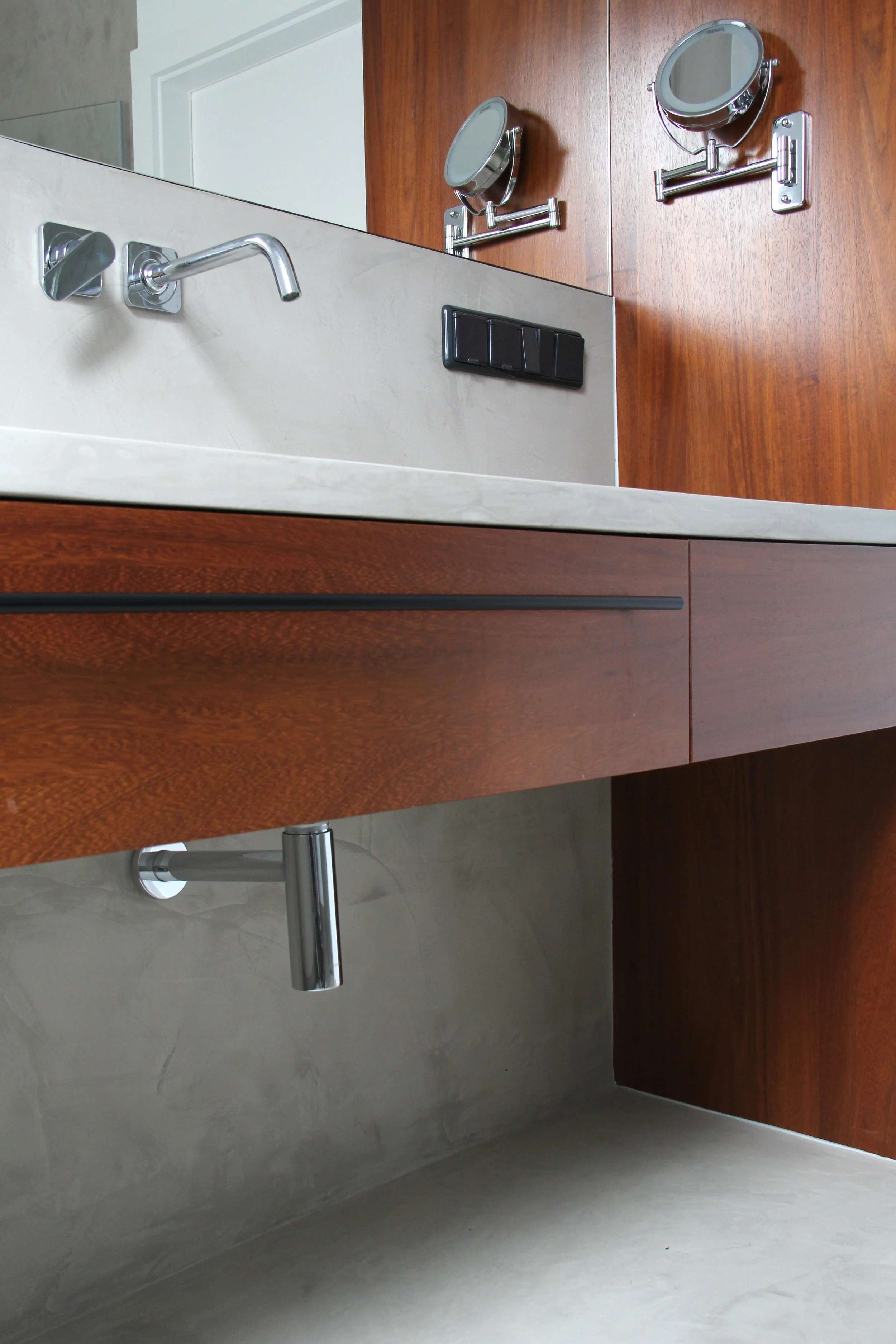 Dzięki temu rozwiązaniu w pomieszczeniu nie ma ani jednej fugi. Materiał jest surowy, i nowoczesny. Zestawiłyśmy go z egzotycznym drewnem, które wprowadziło ciepło do wnętrza.