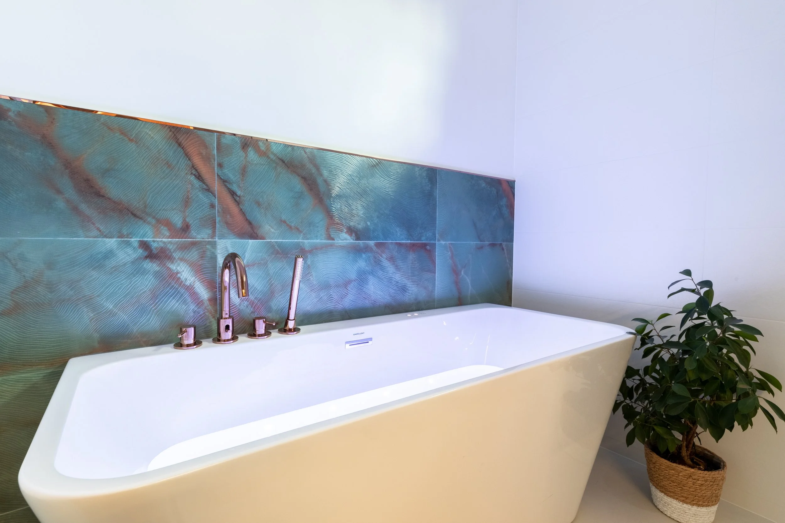 w chromoterapię, idealna do relaksu i codziennego rytuału odprężenia. Tło wanny stanowią efektowne zielone płytki z miedzianymi akcentami i intrygującą strukturą przypominającą rysunek fal na piasku. To one wprowadzają do wnętrza szlachetne, naturalne ciepło