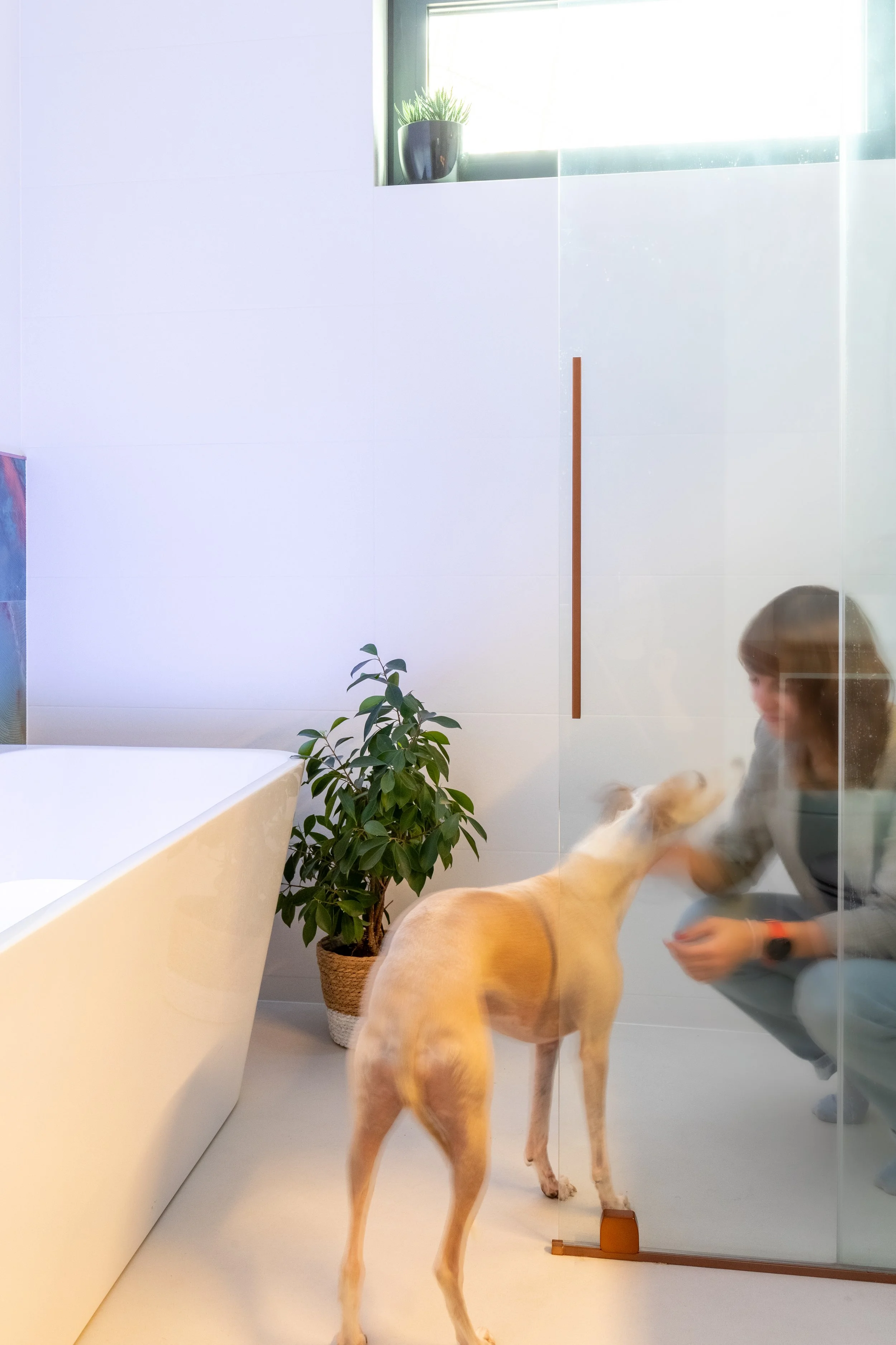 Na końcu pomieszczenia znajduje się rozsuwany prysznic typu walk-in. Rozwiązanie to zostało zastosowane ze względu na wąski układ łazienki ― po otwarciu kabina zyskuje optymalną szerokość podczas kąpieli, co zapobiega chlapaniu wody na zewnątrz, jednocześnie zapewniając komfortowe przejście i wygodne wejście pod prysznic. Specjalnie dobrany wspornik w kształcie litery L pozwolił uniknąć kolizji z oknem, co przy klasycznym, prostopadłym mocowaniu byłoby niemożliwe.